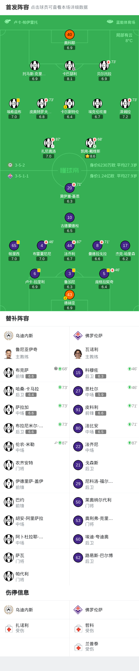 北京时间3月3日意大利足球甲级联赛第27轮,乌迪内斯主场对阵佛罗伦萨。比赛中,乌迪内斯球员先由队友助攻卡巴瑟利打入一球,随后凯南-戴维斯罚入点球,下半场补时阶段米勒助攻布克萨打入一球。最终乌迪内斯以3-0战胜佛罗伦萨。